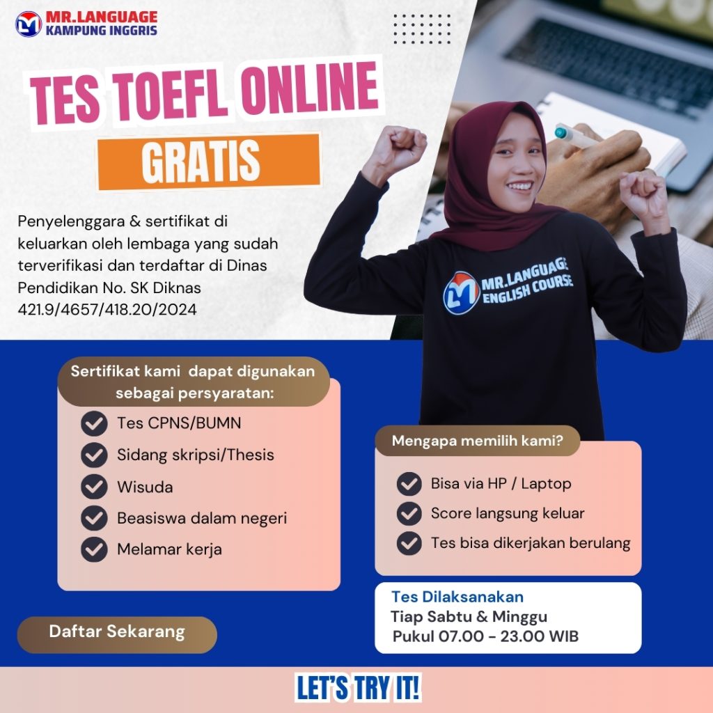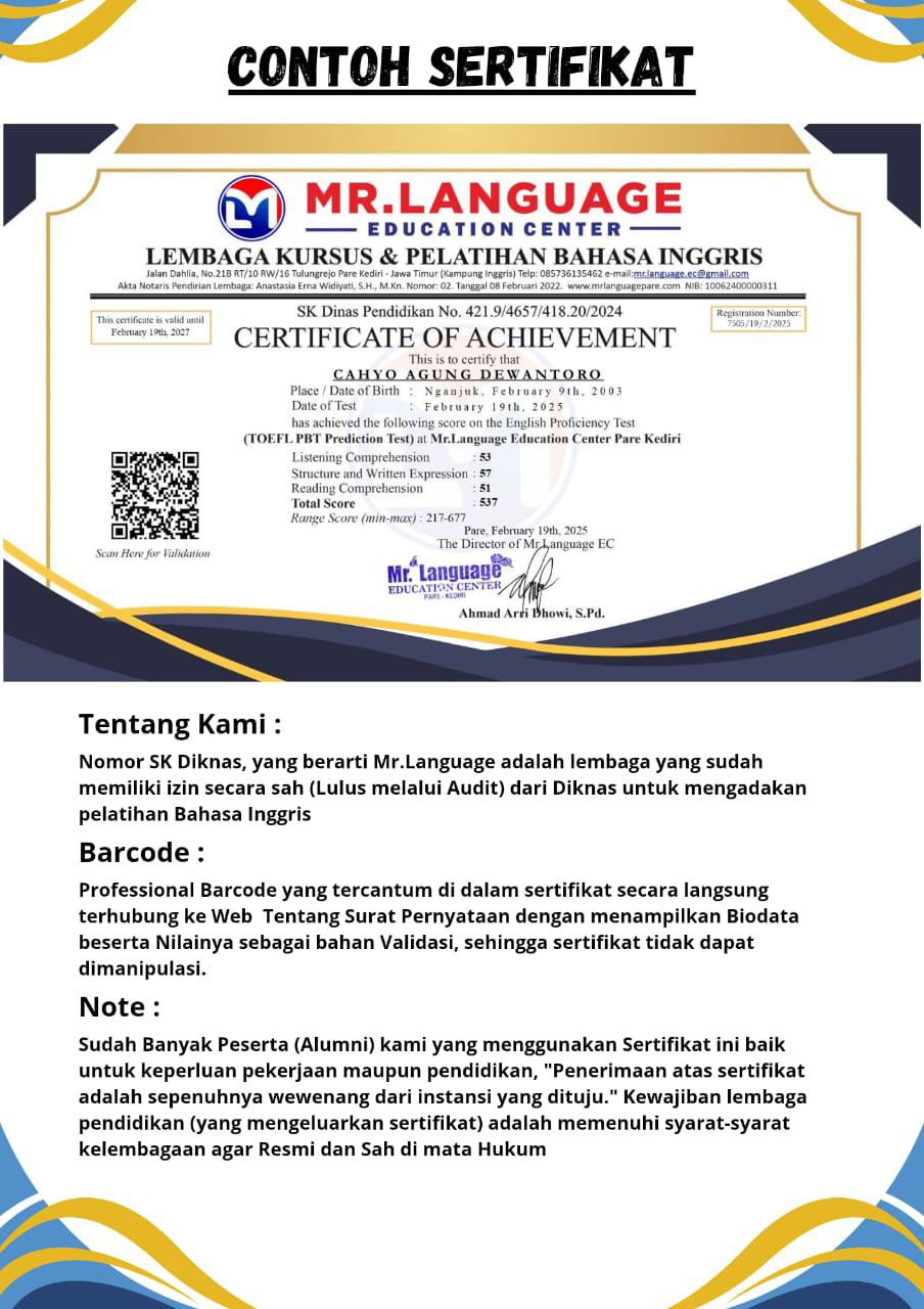 # Tes yang diselenggarakan oleh Lembaga MR.LANGUAGE adalah simulasi dari TEST TOEFL, ETS (ITP) atau sejenis Prediction Test